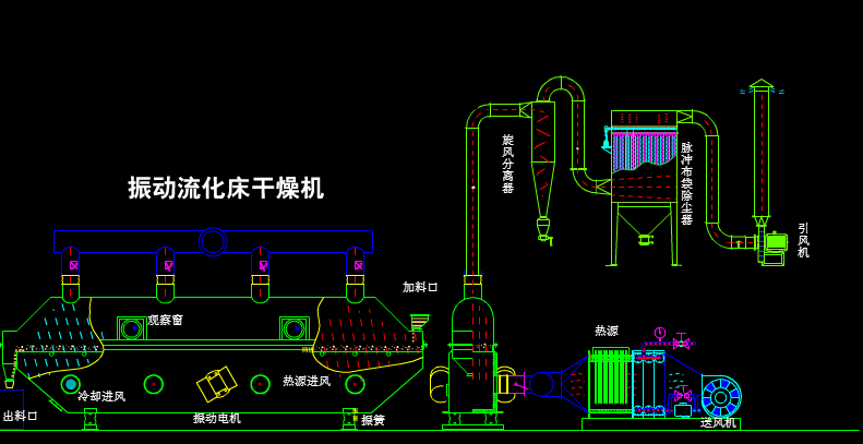物料自进料口进入机内,在振动力作用下,物料沿水平方向抛掷向前连续运动,热风向上穿过流化床同湿物料换热后,湿空气经旋风分离器除尘后由排风口排出,干燥物料由排料口排出。
